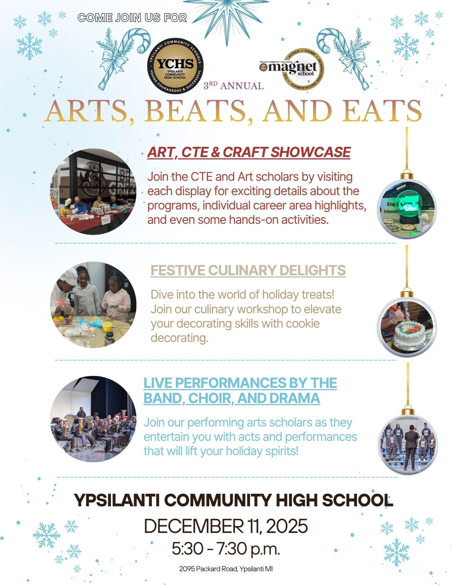 Ypsilanti Community High School is excited to once again host our annual holiday event, Arts, Beats, and Eats, a celebration that brings our school community together to experience the incredible talent and opportunities within our CTE and arts programs. Guests will have the chance to explore each Career and Technical Education program, learn about career pathways, and participate in hands-on activities. Our Culinary students will offer cookie decorating and delicious samples, while our Performing Arts students will showcase live acts guaranteed to lift your holiday spirit. You’ll also enjoy stunning visual art displays created by our talented student artists, along with crafts available for purchase from local community vendors. Join us on Thursday, December 11th, from 5:30 to 7:30 p.m. for this exciting annual event—one you won’t want to miss!