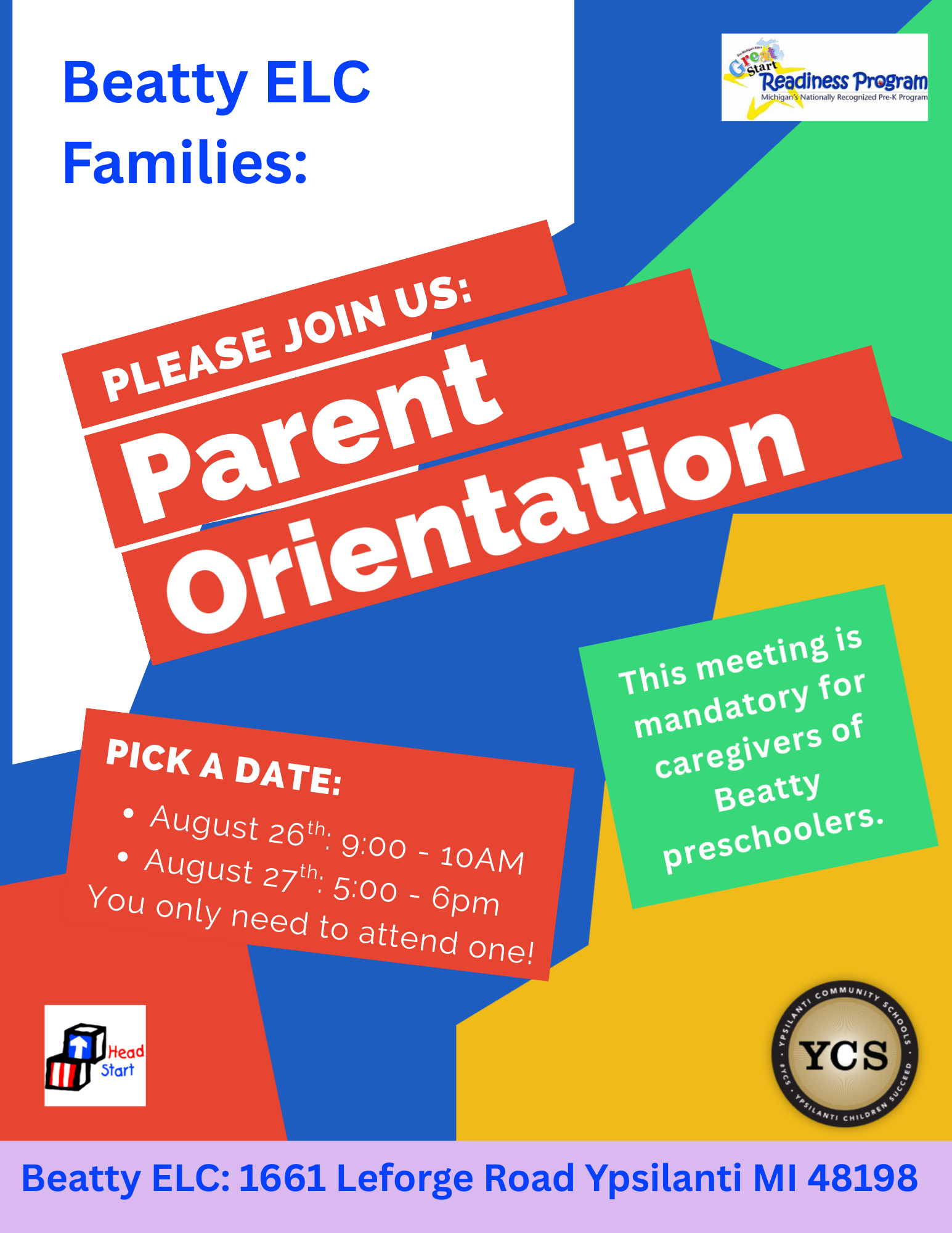 for Parent Orientation. This meeting is mandatory for caregivers of Beatty preschoolers.