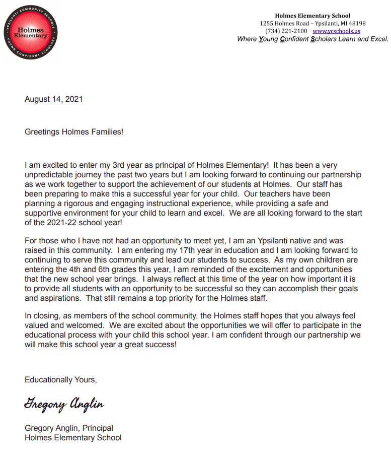 I would like to welcome you to the 2021-22 school year at Holmes Elementary! All classroom assignments have been shared via email, if you have not received your student's 2021-22 classroom assignment please call 734-221-2100.